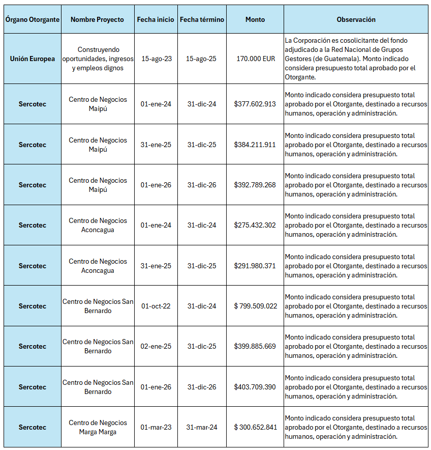 Memorias y Fecu Social Revisa los reportes Fecu Social, Memorias Corporativas y convenios de cada año de operación de la Corporación Construyendo Mis Sueños Memorias Institucionales Memoria 2024 Ver memoria 2024 Memoria 2023 Ver memoria 2023 Memoria 2022 Ver memoria 2022 Memoria 2021 Ver memoria 2021 Memoria 2020 Ver memoria 2020 Memoria 2019 Ver memoria 2019 Memoria 2015-2018 Ver memoria 2015-2018 Fecu Social FECU 2024 Ver FECU 2024 FECU 2023 Ver FECU 2023 FECU 2022 Ver FECU 2022 FECU 2021 Ver FECU 2021 Balance y Estados Financieros 2024 Ver reporte 2021 - 2024 Acuerdos de desempeño Centros de Negocios Aconcagua 2do acuerdo 2do convenio Acuerdo 2do convenio Ampliación 1er convenio Maipú 2do Acuerdo 3er convenio Acuerdo 3er convenio Ampliación 2do convenio San Bernardo 2do Acuerdo 3er convenio Acuerdo 3er convenio Ampliación 2do convenio Proyectos adjudicados mayores a 2.000 UTM